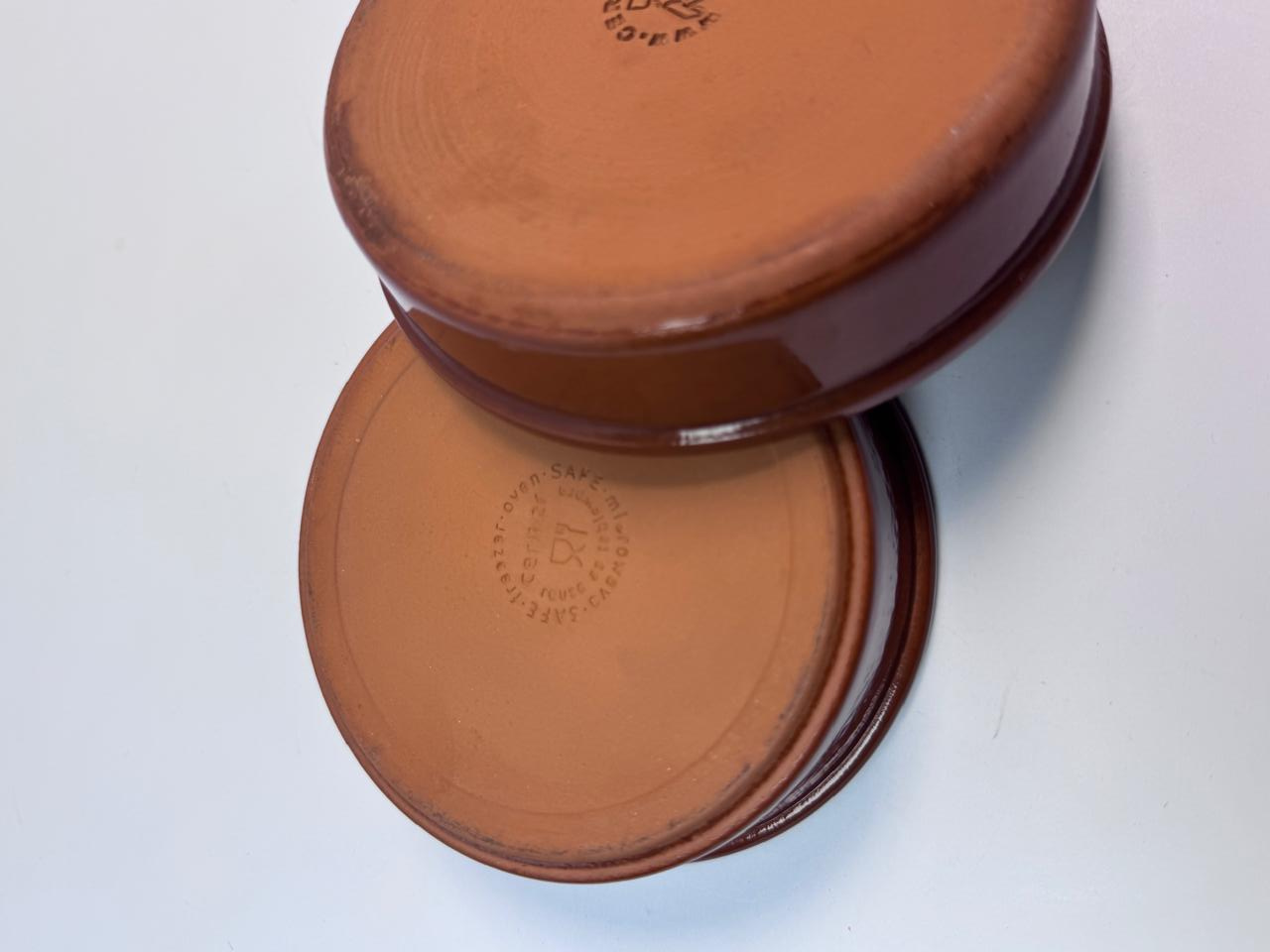 The set of 2 CERMER ramekins is a two-piece terra cotta pottery baking dessert dish set, perfect for baking and serving desserts, these round bowls are 4 inches in diameter and 1 inch in height. The clay-colored bowls are easy to clean, microwave safe, and feature a ceramic surface coating. With a brand known for quality, these ramekins are a stylish and practical addition to your kitchen bakeware collection or kitchen decore. Hand wash only to maintain their beautiful appearance.