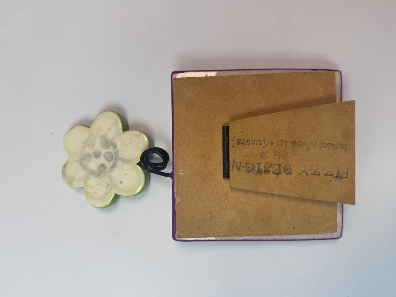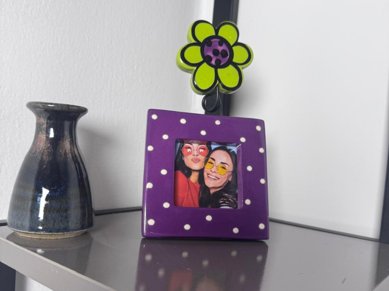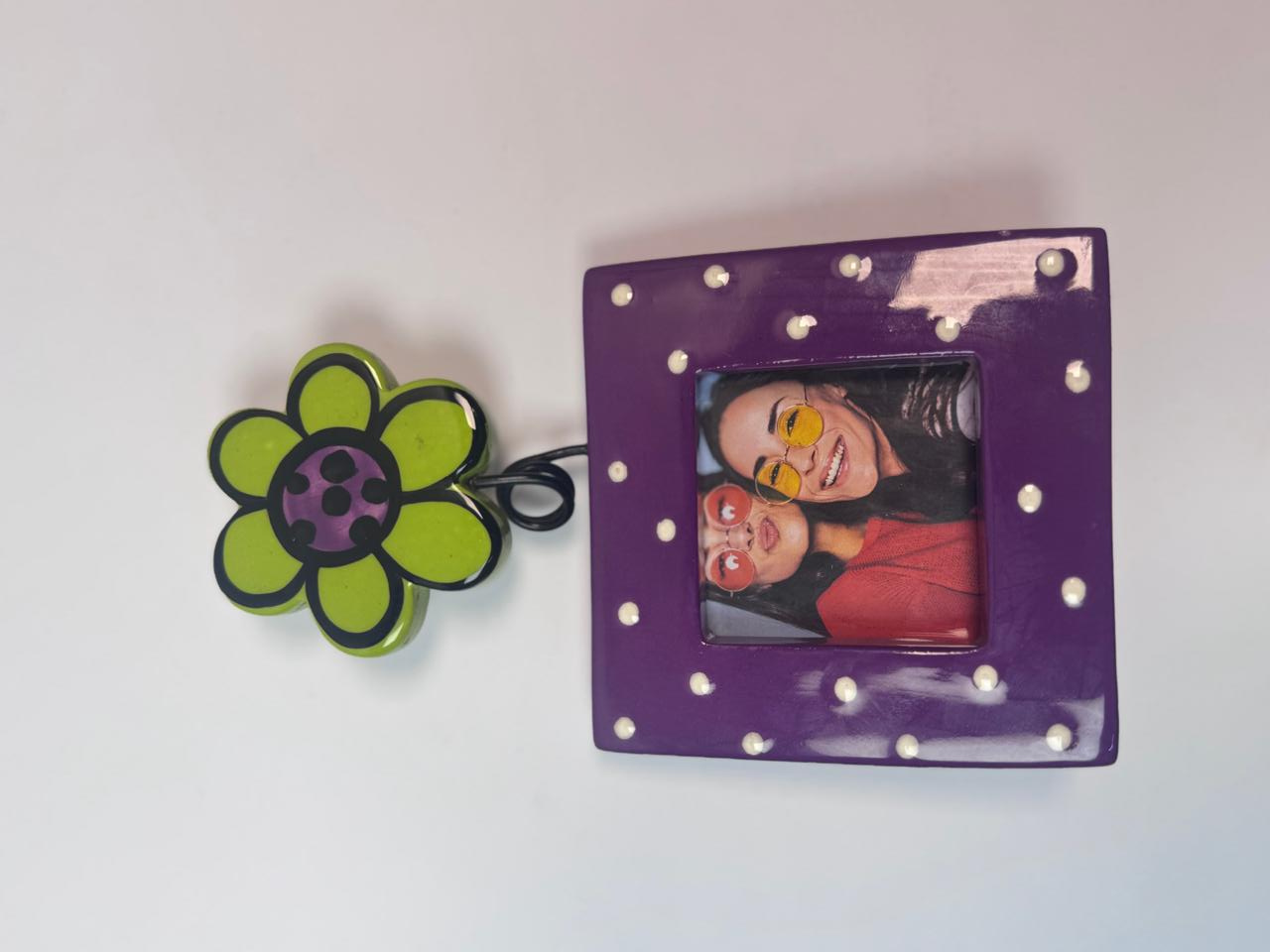 What could be better than sharing moments of warmth and closeness with your friends? This vibrant, hand-made frame is the perfect way to display a favorite memory. With its playful purple-and-white polka dot base and bright green flower accent, it adds a fun, whimsical pop of color to any desk or shelf.