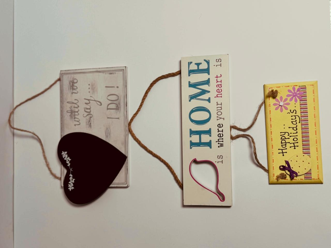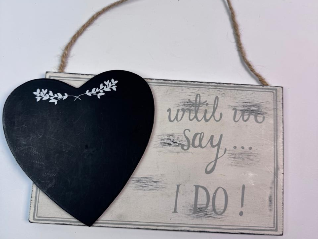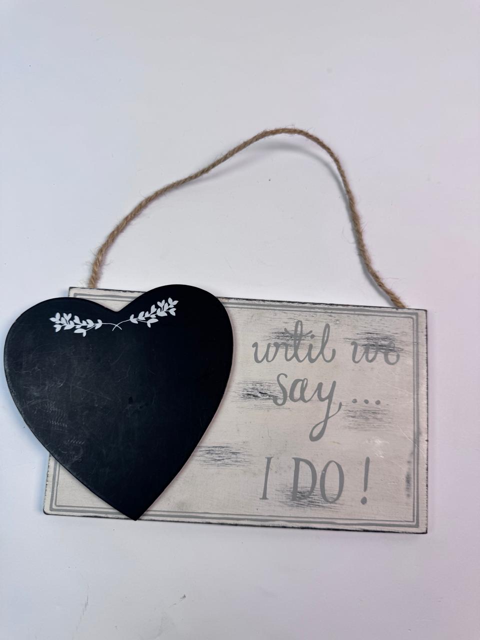 This “Until We Say I Do” Wedding Countdown Sign is a charming, interactive decor piece designed to celebrate the journey to the big day. Crafted with a shabby-chic aesthetic, the sign features a weathered white wooden base and a functional black chalkboard heart adorned with a delicate leafy motif. This heart serves as a customizable surface for manually counting down the days, while the elegant grey lettering and natural jute twine hanger provide a rustic, ready-to-display look.